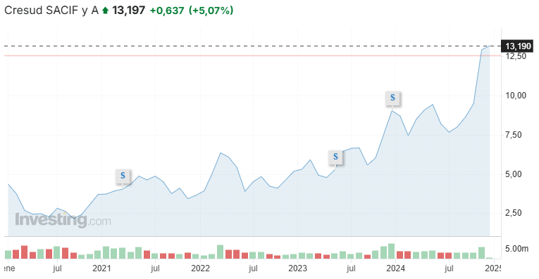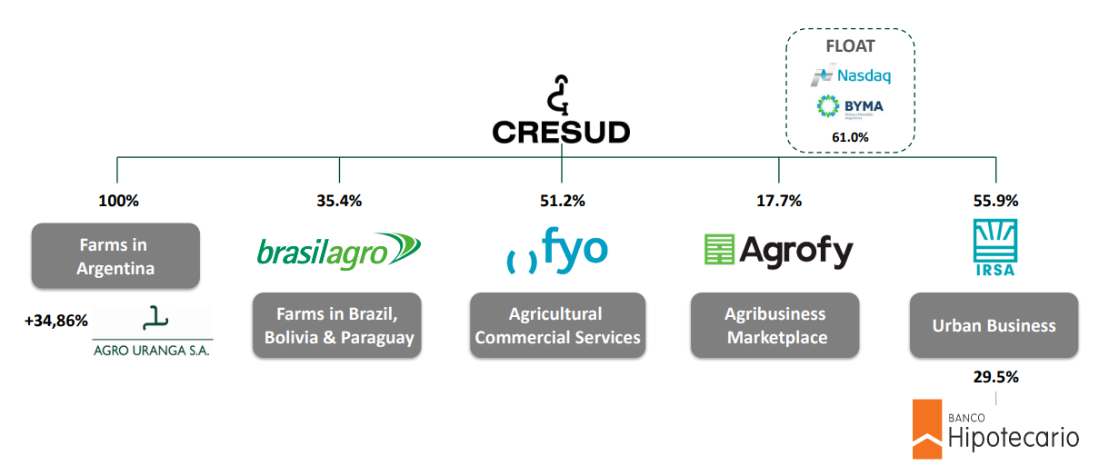 Cresud is an Argentine conglomerate focused on the agricultural sector. It operates a diversified business model that combines agricultural production with a strategic real estate approach. The company owns approximately 880,000 hectares, of which 106,000 are leased, used for cultivating soybeans, corn, sugarcane, and livestock farming. Additionally, it actively engages in land acquisition and development to later sell it at a higher price, following a rotational real estate model. As a conglomerate, Cresud also holds significant stakes in other publicly traded companies, such as BrasilAgro ($LND) and IRSA ($IRS).