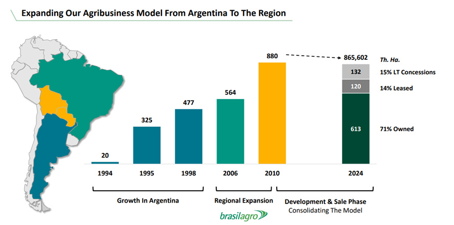 BrasilAgro: Follows the same business model as Cresud's Argentine operations: acquiring rural land with high cash flow potential, transforming and optimizing it (generating returns), and later selling it at a significantly higher value.