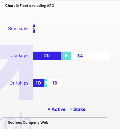 Valaris is the largest offshore contractor globally, with a fleet consisting of 49 assets: 10 state-of-the-art drillships (excluding 3 in cold stack), 2 semisubmersibles, and 34 jackups, in addition to a 50% stake in ARO, a joint venture with Saudi Aramco, which owns another 9 jackups (explained later).