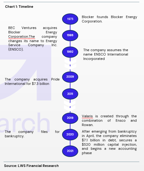In 2019, Valaris was created through the merger of Ensco and Rowan. Due to the depressed macroeconomic environment associated with the pandemic, Valaris filed for bankruptcy in August 2020. After emerging from bankruptcy proceedings in April 2021, the company eliminated $7.1 billion of debt and received a $520 million capital injection through the issuance of first lien notes.