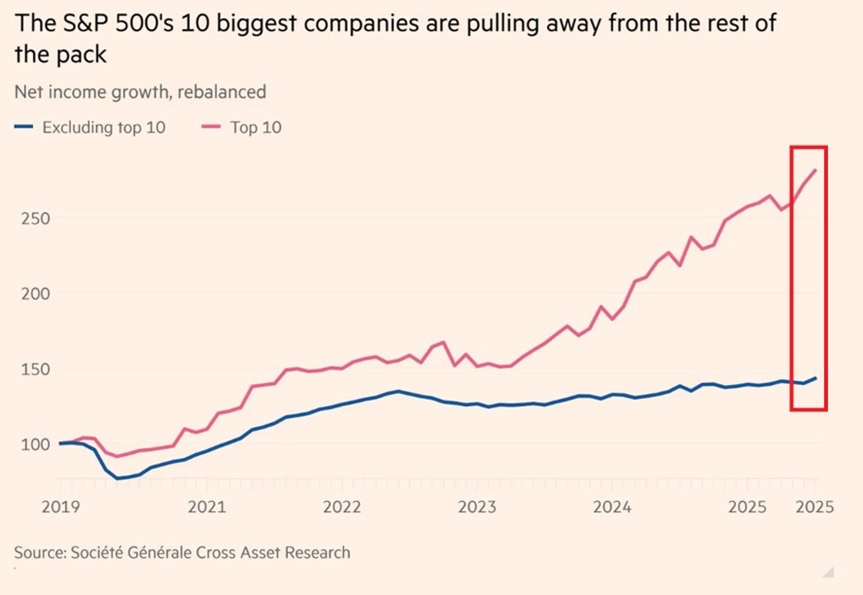 It is true that the market is highly uneven and increasingly less homogeneous, as can be seen in profit growth since 2019: the top 10 companies have increased earnings by 180%, while the rest have grown only 45%. Far from narrowing, this trend has accelerated, making the current valuation level particularly risky: any slowdown among this group of leaders has the potential to drag the market down significantly. In fact, in the second quarter just ended, 52% of companies reported margin declines — a perfect market for stock pickers.