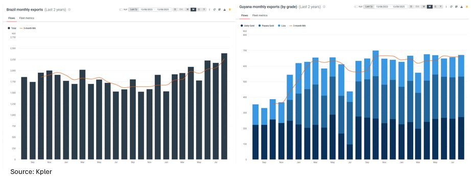 The EIA has released its new STEO (Short-Term Energy Outlook), with the most pessimistic conclusions to date regarding market surpluses and prices (forecasting WTI below $50 in 2026). Even so, it raised its demand estimate for 2025 to +0.98Mb/d (vs. 0.81Mb/d previously) and to 1.19Mb/d in 2026 (vs. 1.05Mb/d). At current prices, as we have seen many times before, U.S. shale has little incentive to grow (even less so at $50…), and in the latest STEO supply growth estimates were once again revised downward. In fact, only Brazil and Guyana are contributing growth this year, far below the estimates made at the start of the year.