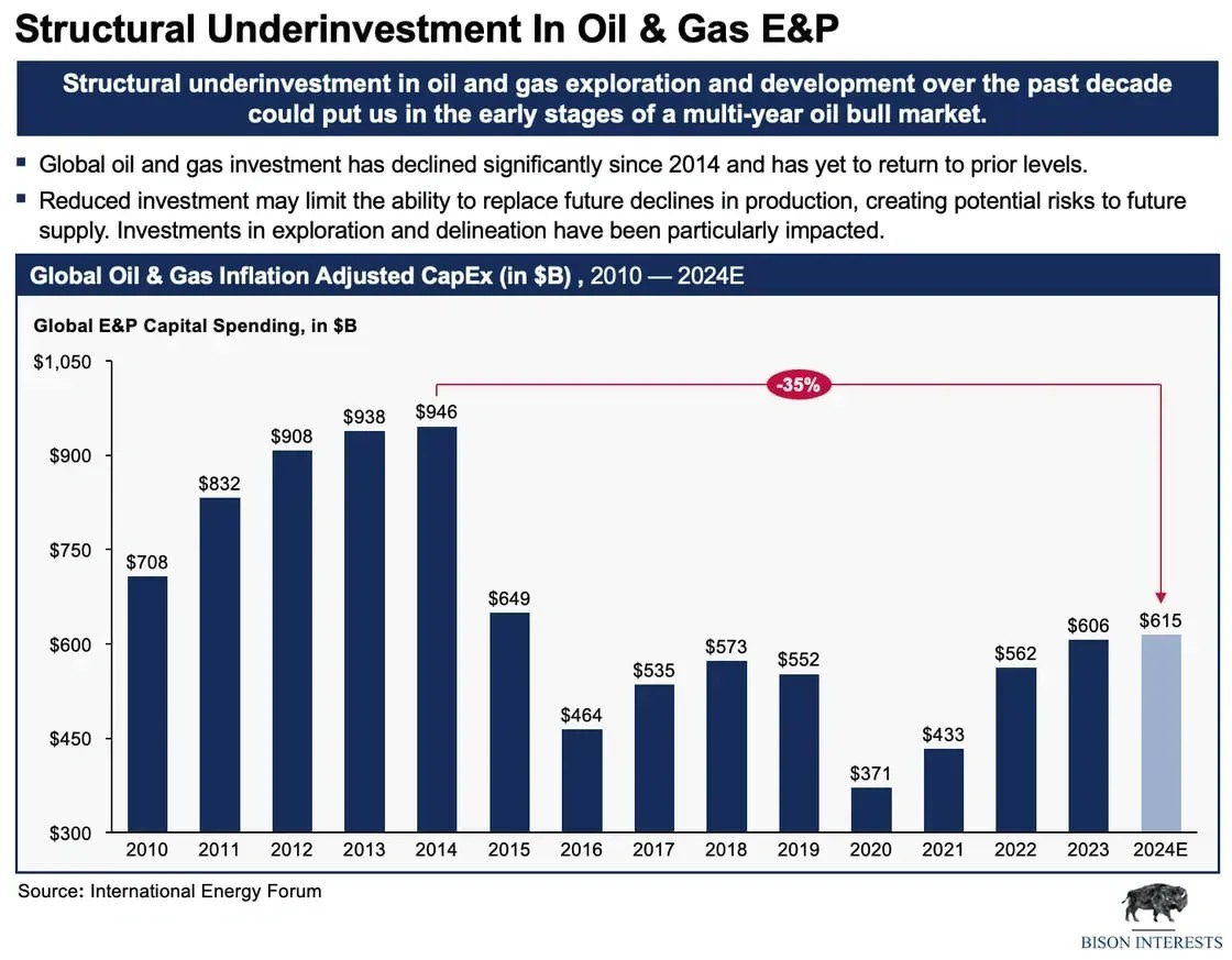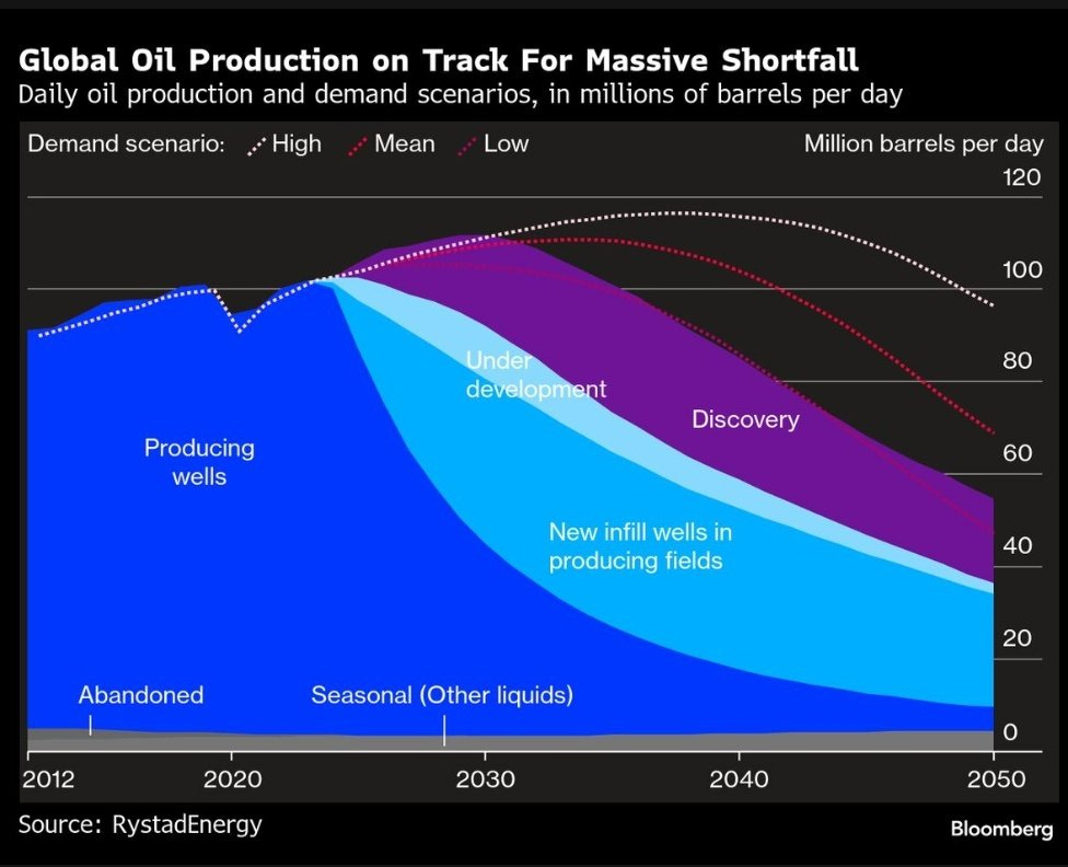 Although exploration and production investment figures have recovered since 2016–2020, they remain well below the levels seen during the last oil boom, and clearly insufficient given the geological decline of many major fields and basins.