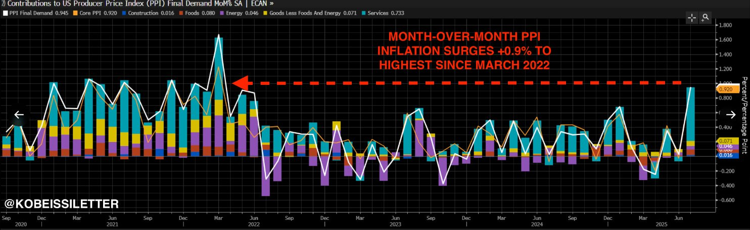 The figure was ugly enough to abruptly halt the optimism that had driven the S&P and Nasdaq to fresh record highs earlier this week. Gains had been fueled by the belief that inflation was tamed, the labor market was showing cracks, and cuts were imminent. But the reality is that part of the market is so thirsty for liquidity it will buy into any excuse — until a hard number like this PPI comes along and brings everything back to earth. A very 2022 déjà vu triggered by tariffs.